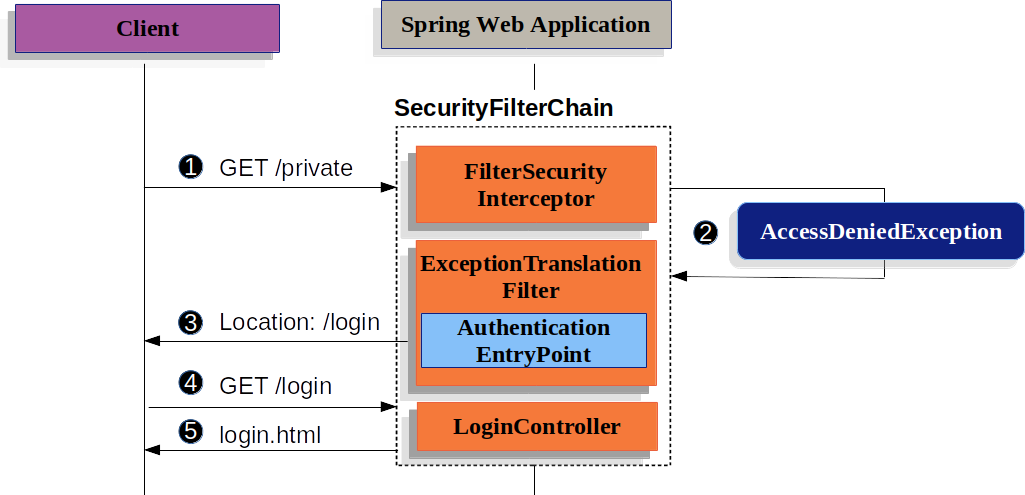 +image:{icondir}/number_2.png[] Spring Security's <<servlet-authorization-filtersecurityinterceptor,`FilterSecurityInterceptor`>> indicates that the unauthenticated request is __Denied__ by throwing an `AccessDeniedException`.